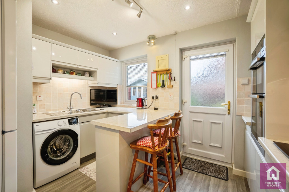 The kitchen is fitted with a breakfast bar, ample storage units, an electric hob and included white goods, with a door leading out to the rear garden. Some select furniture is also available with the sale.